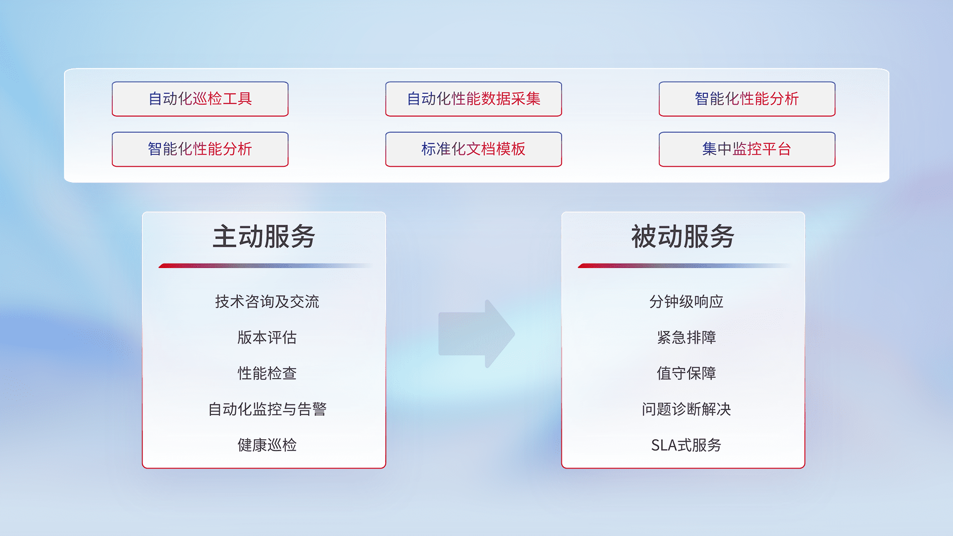 智能化工具和标准化文档,,保障服务质量,,提供主动服务(包含技术咨询、、版本评估、、、、性能检查、、、、自动化监控与告警、、、健康巡检)和被动服务包含(分钟级响应、、、紧急排障、、、、值守保障、、问题诊断解决、、、、SLA服务)。。。。