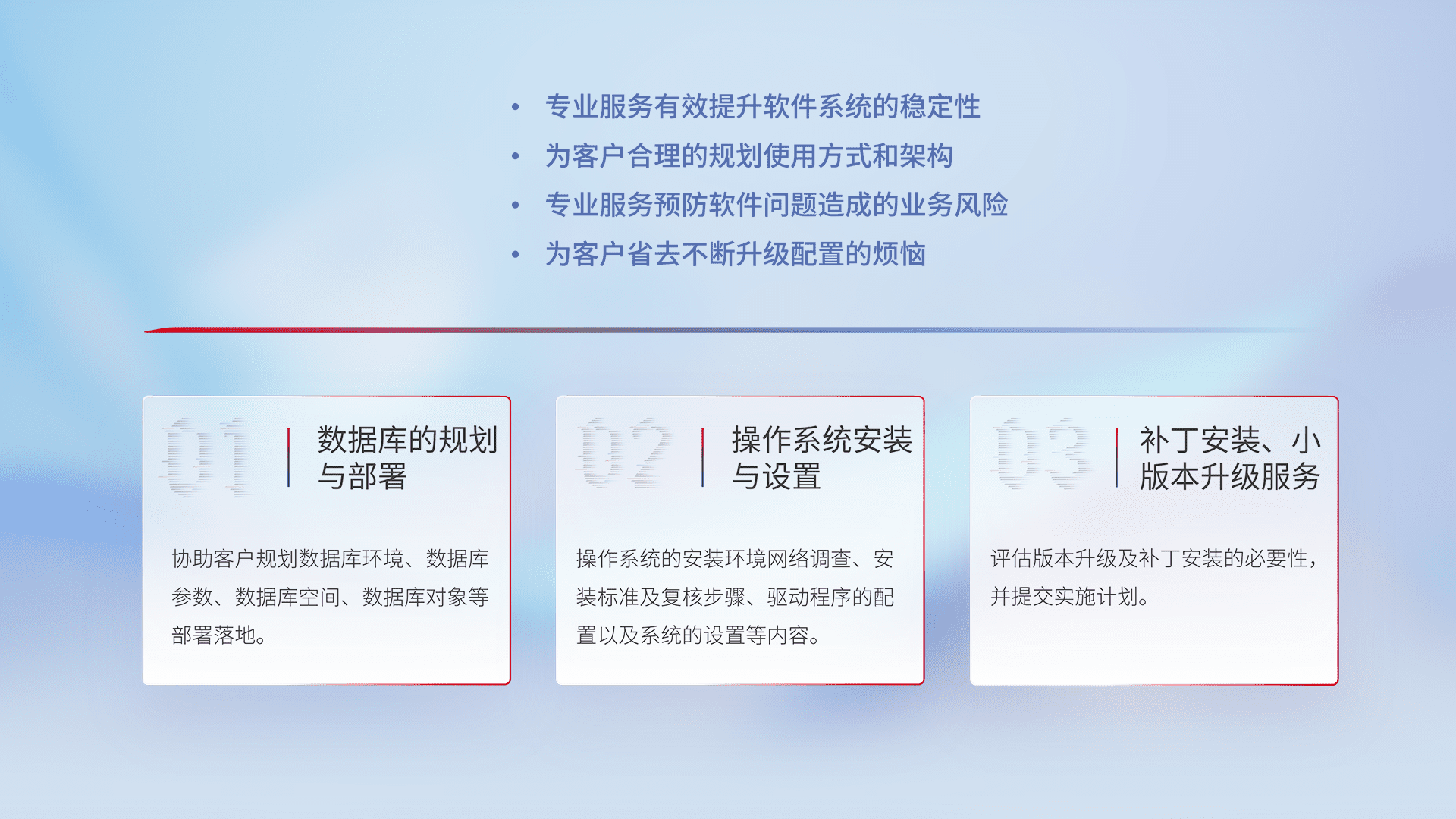 为客户提供软件规模升级、、、、快速部署、、按需配置的专业服务,,从数据库的规划与部署到操作系统的安装与设置,,再到补丁安装和小版本升级提供支持。。。
