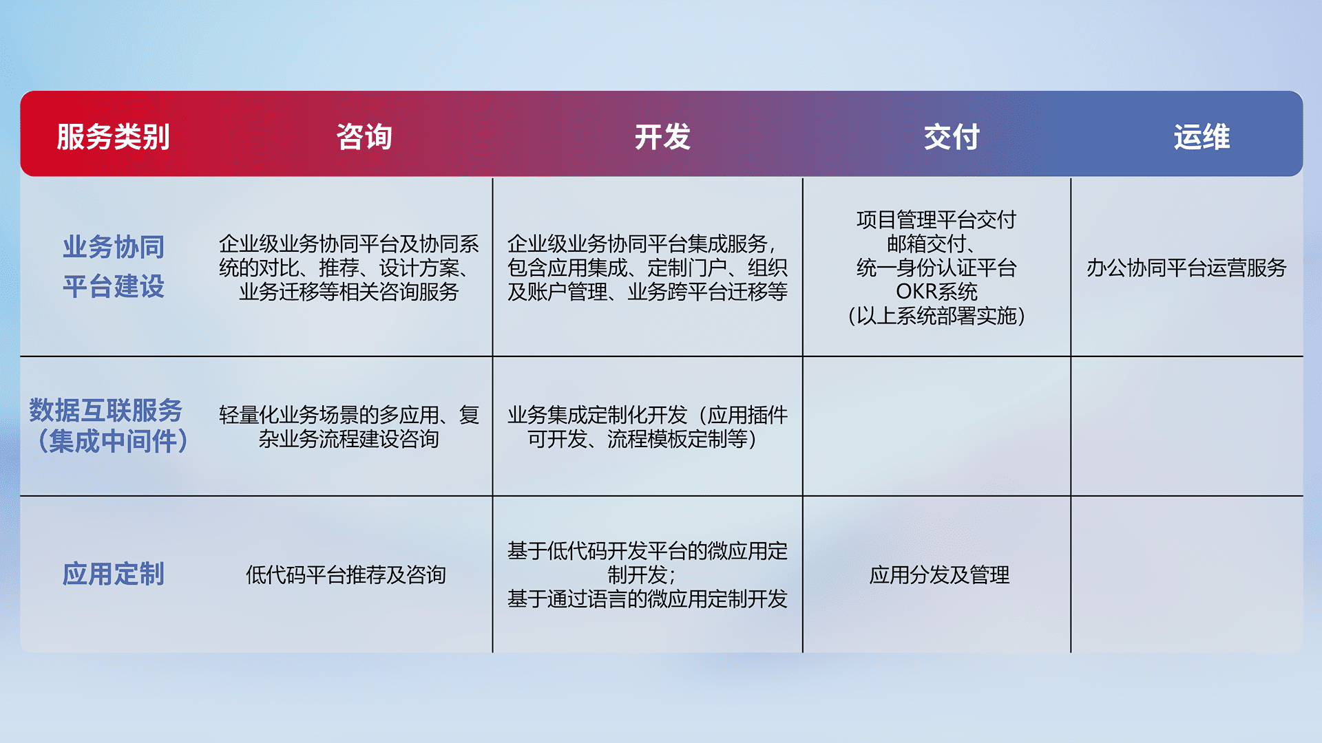 针对钉钉、、企微、、IDaas等平台级产品提供产品的规划、、方案、、交付、、定制化开发等服务,,,,实现如统一协同办公、、智能客户服务、、、混合会议管理、、、、智能数据查询、、、、等业务场景,,,实现数字化转型。。